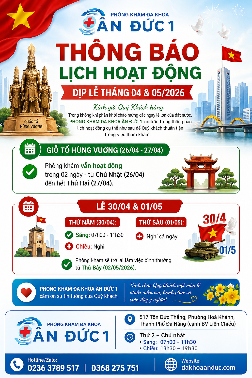 Trong không khí phấn khởi chào mừng các ngày lễ lớn của đất nước, PHÒNG KHÁM ĐA KHOA ÂN ĐÚC 1 xin trân trọng thông báo lịch hoạt động cụ thể như sau để quý khách thuận tiện trong việc thăm khám: